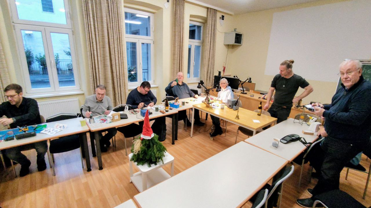 Lötübung für Einsteiger wurde gut angenommen. Beim Treffen im Clubheim, nach dem Flohmarktbesuch vom Vormittag, kam eine Gruppe von YL und OMs im Clubheim zusammen. Die von Arnold OE1IAH organisierten Bäume wurden gemeinsam aufgebaut. Stefan OE1UHU war einer der Bäumebauer. Durch seine Berufserfahrung zählte er zu den besonders geeigneten Unterstützern der Löteinsteiger.