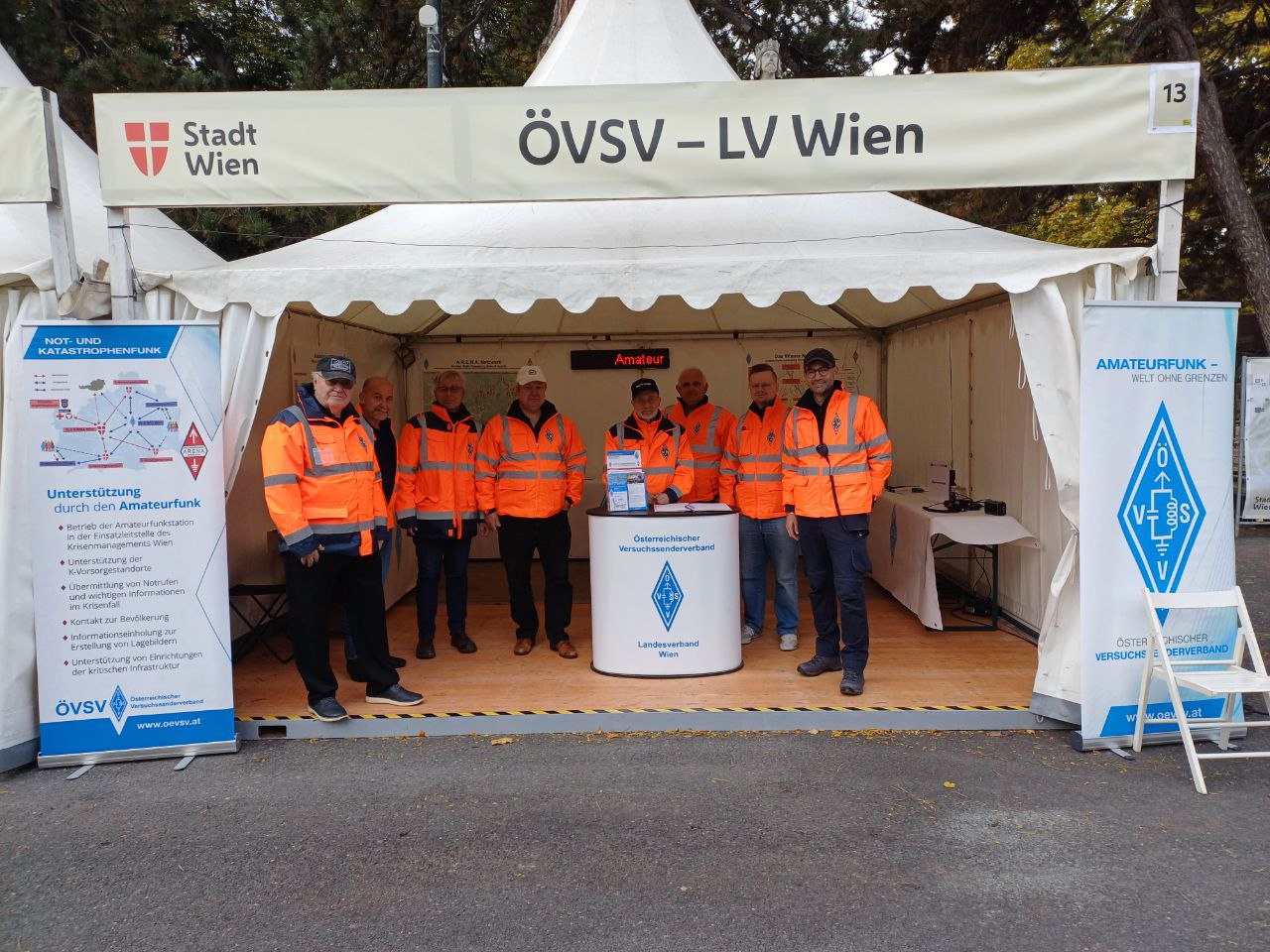 Der LV1 bespielte eine der Pagoden. Wir präsentierten allgemeine Amateurfunkthemen - passend zum Motto des Festes - Not- und Katastrophenfunk. Das diente vor allem den Kontakt zu den anderen Organisationen der Helfer Wiens zu vertiefen, Kontakt mit der Politik zu halten und Besuchern Information zu unserem Hobby zu geben.