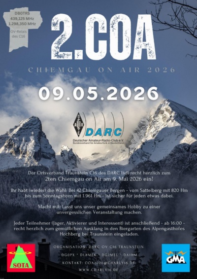 Wichtig!! Teilnehmermeldung für den CoA-Tag am 9. Mai 2026: Anmeldungen bitte auf der SOTA-Seite als Alert/Ankündigung mit dem Vermerk: CoA 2026 Chiemgau on Air