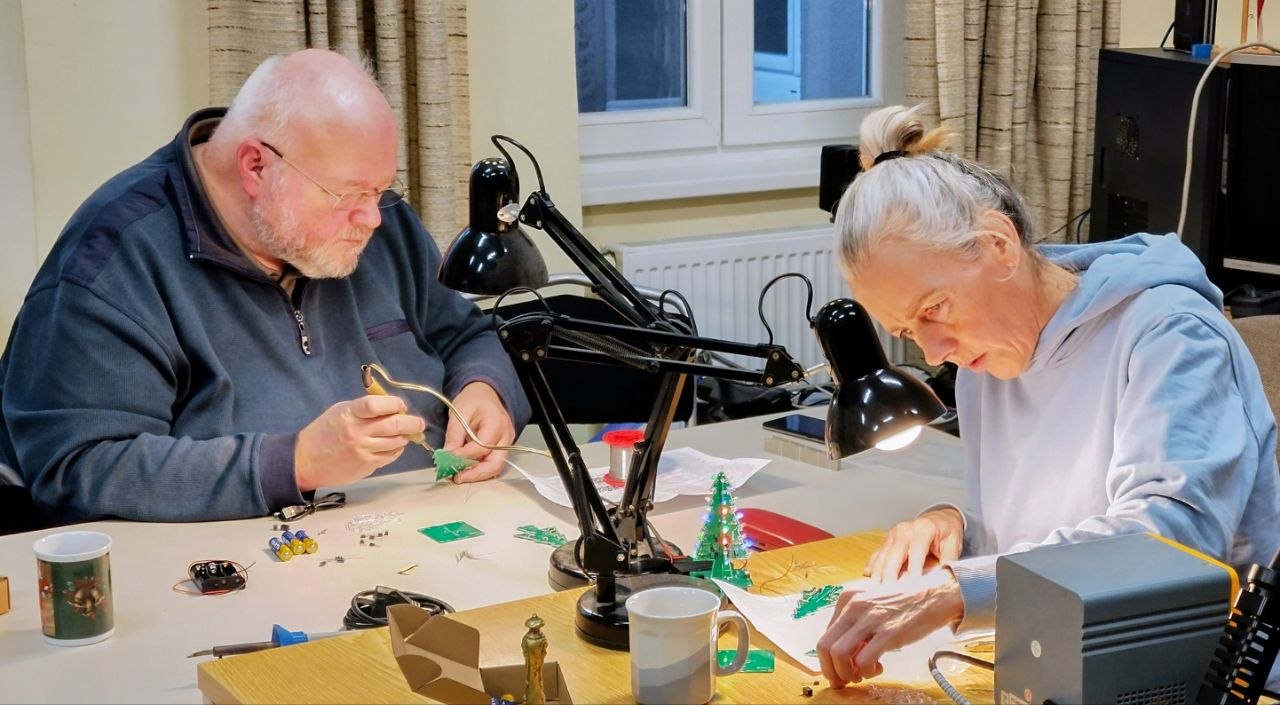 Lötübung für Einsteiger wurde gut angenommen. Beim Treffen im Clubheim, nach dem Flohmarktbesuch vom Vormittag, kam eine Gruppe von YL und OMs im Clubheim zusammen. Die von Arnold organisierten Bäume wurden gemeinsam aufgebaut. Stefan OE1UHU war einer der Bäumebaer. Durch seine Berufserfahrung zählte er zu den besonders geeigneten Unterstützern der Löteinsteiger.