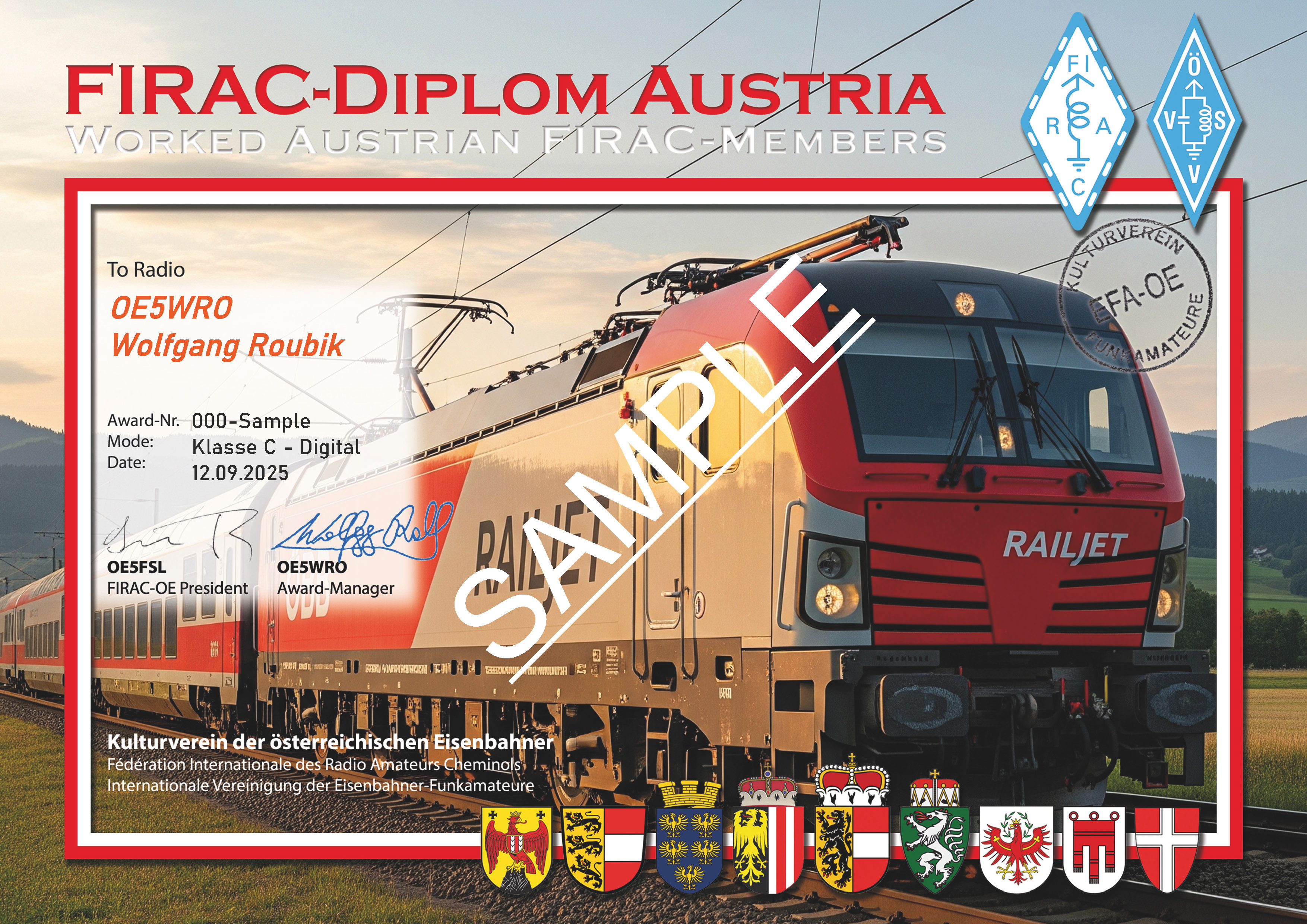 Dieses Diplom wurde von der FIRAC-OE (Fédération Internationale des Radio Amateurs Cheminots - Internationale Vereinigung der Eisenbahner Funk-Amateure) gestiftet. Achtung: Antragstellung beim Award-Manager der FIRAC-OE (siehe unten)!